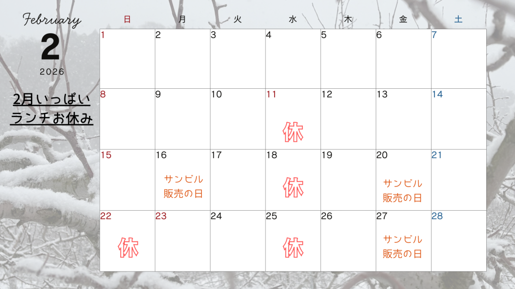 2026年2月16日 / 最終更新日 : 2026年2月16日 micafe mi cafeから 2月の営業🍎 とっても遅くなりましたが、この後の2月の営業予定です〇 サンビルさんでの販売は、27日が最終日とさせていただきます🙌 FacebooktwitterHatena